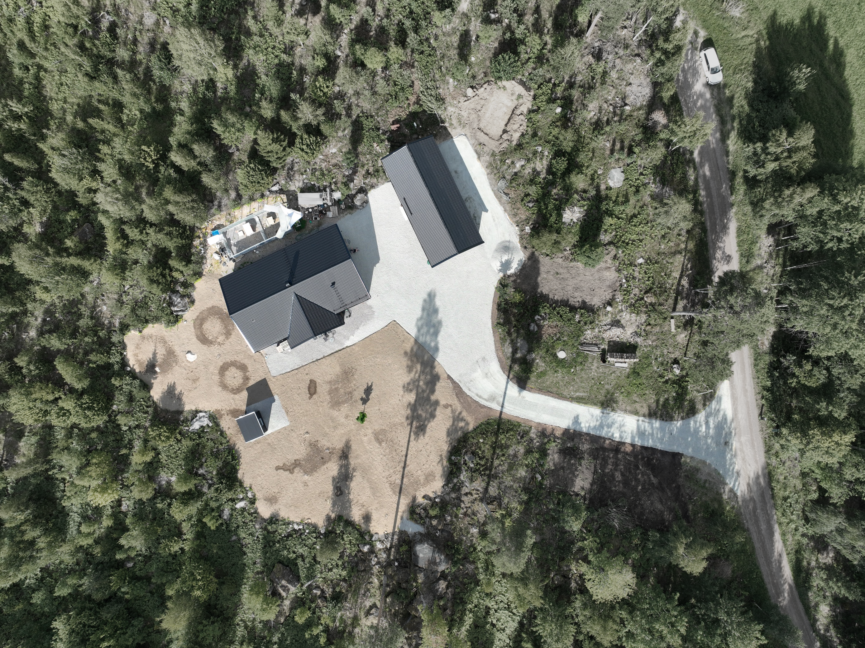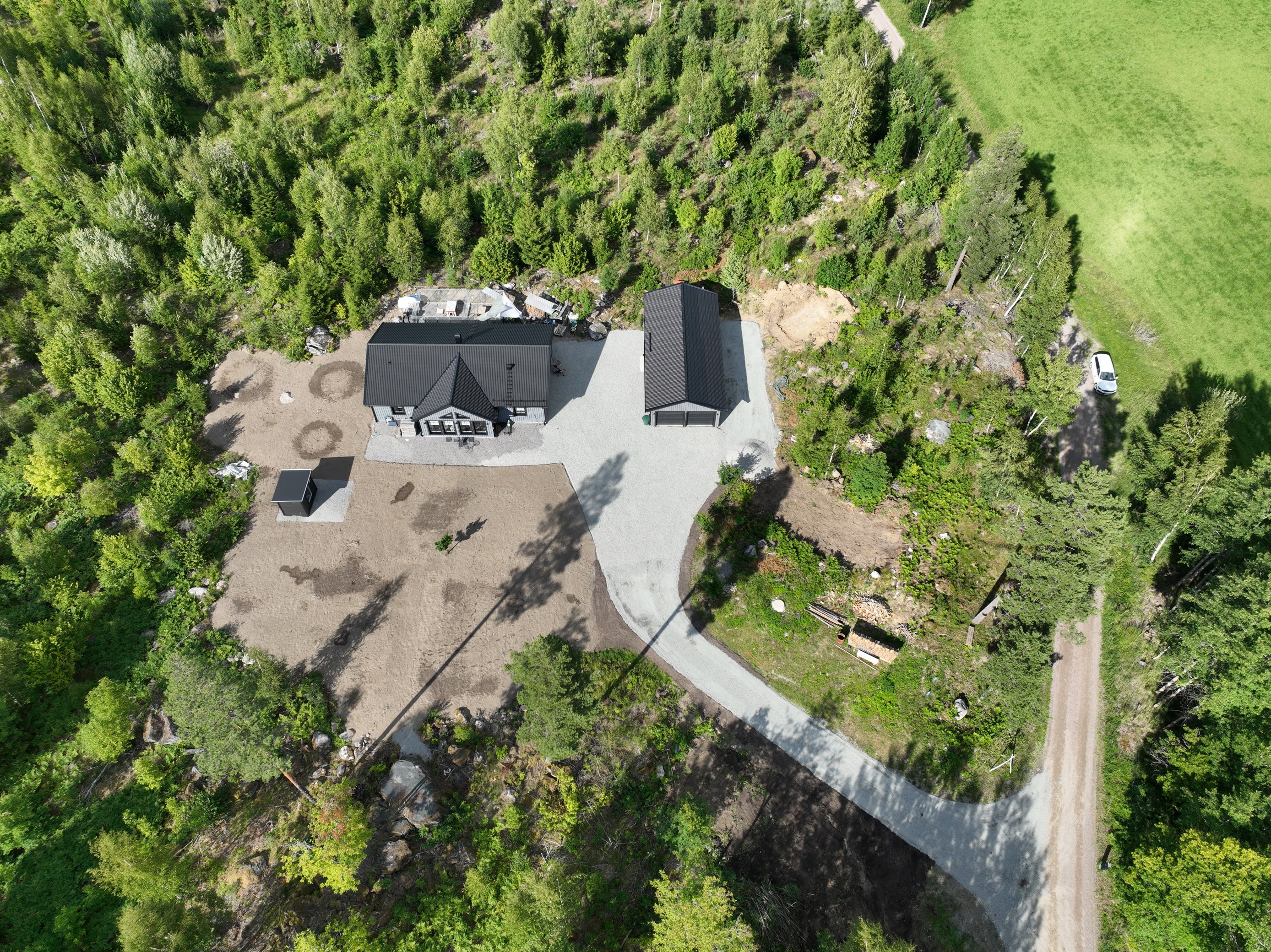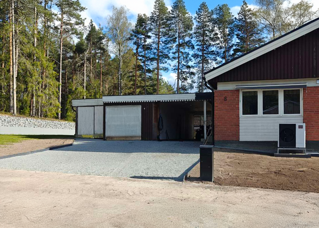 Tomtplanering genomförd åt privatkund. Den stilrena singelbeläggningen binder samman uppfarten, huset och garaget på ett enhetligt sätt. Genom att låta singelytan omsluta huset skapas en naturlig helhet som lyfter bostadens uttryck.