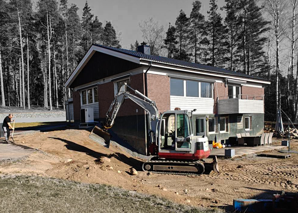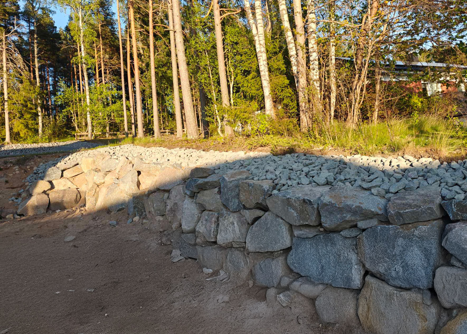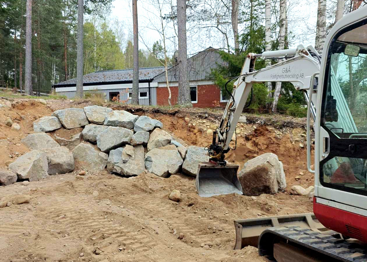 Omfattande tomtplanering åt privatkund innefattande bland annat anläggning av uppfart och upprättande av stenmur för att fånga upp höjdskillnaden på tomten. En praktisk lösning som också ramar in och delar av på ett naturligt sätt.
